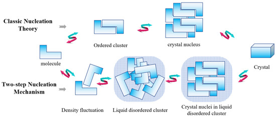 Crystal nucleation theory has been developed for nearly 300 years, dating back to the 18th century when Fahrenheit studied the freezing of supercooled water and established the “old” dynamical model of nucleation [17]. With the further development of nucleation research, two schools have gradually arisen, as summarized in Figure 2, respectively, providing corresponding “structural models” to describe the nucleation process [17]. Classic Nucleation Theory (CNT) is the earliest widely accepted nucleation theory [17,18] and has a relatively comprehensive thermodynamic and kinetic basis [18,19]. It holds that fluctuations in density and order occur together in supersaturated solutions, forming solution molecular clusters, and the assembly structure of such clusters can reflect all possible polymorphic structures of solute molecules. That is to say, the nucleus formed has the same microscopic packing structure as the mature crystals. In recent years, with the rapid development of computer technology, spectroscopy, and other advanced methods and equipment, the study of crystal nucleation has deepened. More and more experimental and molecular simulation evidence reveals that there are stable pre-nucleation precursors in some solutions, meaning the nucleation path may be two-step or even multi-step. And then, the corresponding non-classical nucleation path is gradually derived [20,21], such as the two-step nucleation mechanism [18] (Figure 2). In this theory [22], the formation of crystal-ordered structures is preceded by dense but disordered liquid phase separation, and density fluctuation and order fluctuation are unrelated, that is, the solution will first form dense disordered clusters similar to liquids, and then produce crystalline order. At present, both theories have formed the corresponding thermodynamic and kinetic basis [17,18,19], which will not be detailed here.