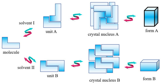 With the advancement of computational chemistry and spectral technology, scholars have increasingly focused on the correlation between solution and crystal structure in organic small molecule nucleation research. This aims to gain a better understanding of the nucleation path and mechanism by examining structures before and after nucleation. In recent years, there has been significant international progress in understanding the molecular pathways involved in organic compound solution nucleation and regulating crystal nucleation [18,36]. On the one hand, the correlation between solute structures in solution and in solid state is utilized as a tool to investigate the process of molecule-to-crystal nucleation. Therefore, multi-structure systems, such as polymorphs [37,38], eutectic [39], and solvates [40,41,42], are selected as study models that can provide a richer structure probe. For example, Desiraju et al. monitored the process from solution through supramolecular synthons to co-crystals between aniline-phenol with NMR [43]. On the other hand, different methods are used to control the nucleation of crystals (e.g., polymorphs), such as changing the solvent [44,45], supersaturation [46,47,48], adding soluble additives [49,50,51] or insoluble templating agents [52], and introducing laser [53], etc. The two aspects mutually support, promote, and complement each other. Therefore, studying the nucleation pathway of ubiquitous polymorphs is a crucial component in understanding crystal nucleation pathways and has been extensively researched [18] (Figure 4). According to the classification of crystal form structures, two corresponding research routes are conclusively identified here. Few research reports have summarized the progress of crystal research according to this classification.