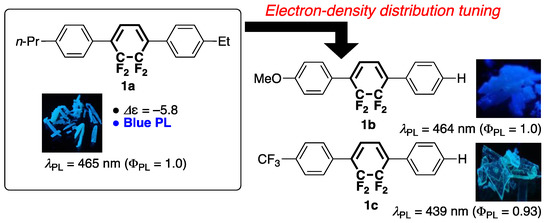 Previously, we prepared a tricyclic molecule with a central tetrafluorocyclohexa-1,3-diene ring (1a) as a guest molecule with negative dielectric anisotropy to develop vertical alignment-type LC materials [15,16,17,18] and showed that 1a exhibits blue PL in the crystalline and solution states. On this basis, we synthesized analogous tricyclic molecules with controlled electron density along the long molecular axis (1b and 1c) and revealed that their PL behavior is greatly affected by the electron density distribution, which, in turn, is influenced by the electronic properties of terminal substituents (Figure 1) [19].