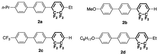 Building on the abovementioned results, we herein synthesized and characterized molecules 2a–d to examine how PL and LC properties are affected by the position of the tetrafluorocyclohexa-1,3-diene ring in the tricyclic structure and the electronic properties of terminal substituents (Figure 2) [15,18].