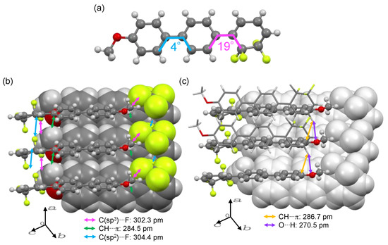 Compound 2b crystallized in an orthorhombic system (P 21 21 21 space group) and featured a unit cell with four molecules. The dihedral angle between the two aromatic rings of the biphenyl moiety was approximately 4°, and that between the tetrafluorocyclohexa-1,3-diene ring and the biphenyl moiety was approximately 19° (Figure 3a). In 1b, which has a central tetrafluorocyclohexa-1,3-diene ring, the dihedral angle between the cyclohexa-1,3-diene ring and the adjacent aromatic ring was at least 31° [19]. On the basis of the molecular structures of 1b and 2b, we concluded that the change in the position of the tetrafluorocyclohexa-1,3-diene ring from central to terminal favored a more planar structure. The space-filling model representation in Figure 3b suggests that the π/F interactions [26,27] between the π-electrons and F atoms of tetrafluorocyclohexa-1,3-diene resulted in the formation of a stacked structure along the a-axis. The C(sp2)···F interatomic distance corresponding to the π/F interaction (304.4 pm) was shorter than the sum of van der Waals radii (317 pm) of carbon (170 pm) and fluorine (147 pm) atoms [10]. The molecule represented by the space-filling model formed molecular packings featuring two pairs of CH/π interactions [28] with the molecule represented by the ball-and-stick model along the b-axis direction. The C(sp2)···H interatomic distance corresponding to the CH/π interaction worked (284.5 pm) was also shorter than the sum of the van der Waals radii (290 pm) of carbon (170 pm) and hydrogen (120 pm). In addition to the short distance between the C(sp2) and H atoms, the carbon atom of the methoxy group was in close contact with the fluorine atom at a distance (302.3 pm) shorter than the sum of carbon (170 pm) and fluorine (147 pm) van der Waals radii. The molecule represented by the ball-and-stick model also formed a stacked structure with the molecule represented by the wire-frame model along the a-axis via CH/π interactions (short contact: 286.7 pm) and O/H hydrogen bonds (short contact: 270.5 pm) (Figure 3c). Accordingly, herringbone-type packing structures were formed through multiple intermolecular interactions. However, unlike the packing structure of 1b [19], which features a central cyclohexa-1,3-diene ring, the packing structure of 2b did not feature intermolecular π/π stacking.