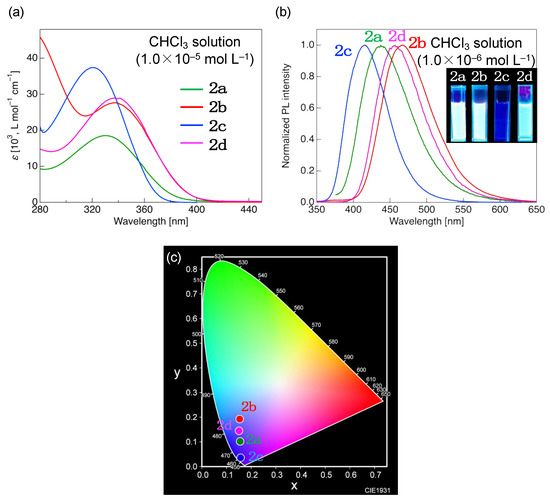 (a) Ultraviolet/visible absorption spectra (concentration: 1.0 × 10–5 mol·L−1) and (b) photoluminescence (PL) spectra (concentration: 1.0 × 10–6 mol·L−1) of 2a–d measured in chloroform (CHCl3). Inset: photographs of PL in CHCl3 solution under UV irradiation (λex = 365 nm). (c) Commission Internationale de l’Eclailage (CIE) chromaticity diagram for PL colors of 2a–d.