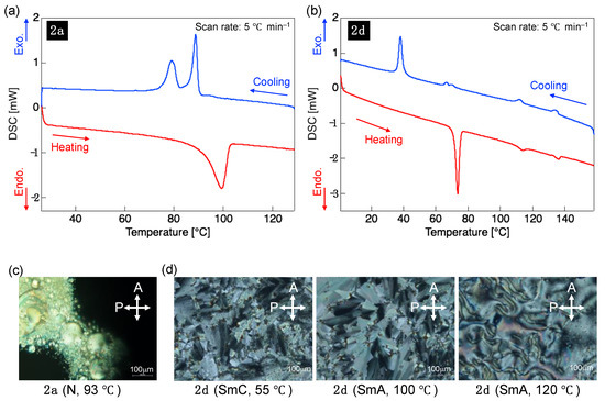 Differential scanning calorimetry (DSC) curves of (a) 2a and (b) 2d recorded during the second heating and cooling processes at a scan rate of 5 °C·min−1 under N2. Polarizing optical microscopy textures in the mesophases of (c) 2a and (d) 2d.