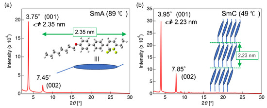 These diffraction peaks corresponded to the plane indices of (hkl) = (001) and (002). The peak at 3.75° in the low-angle region corresponded to a d-spacing of 2.35 nm, according to Bragg’s equation, which was consistent with the longitudinal molecular length of 2d (Figure 8a) This consistency of the interlayer distance with the molecular length agreed with the formation of a smectic A (SmA) phase with a layered periodic structure wherein the long molecular axis was oriented in the direction of the layer normal. In the pattern recorded at 49 °C, the peak of the (001) plane appeared at 3.95° and corresponded to a d-spacing of 2.23 nm, which was shorter than the molecular length along the long molecular axis (2.35 nm) (Figure 8b). This result indicated the presence of a smectic C (SmC) phase featuring a tilt angle with respect to the layer normal (Figure 8b).