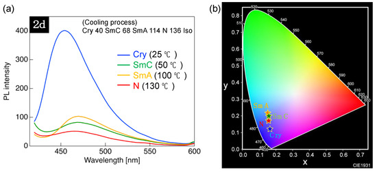 In the case of 2d, a PL band with λPL ≈ 466 nm appeared in the N phase; however, the related PL intensity (IN) decreased because of the accelerated nonradiative deactivation by micro-Brownian motion upon heating. The N→SmA phase transition observed upon cooling induced a 2.0-fold PL intensity increase (I/IN = 2.0) along with a slight red shift in λPL. No significant change was observed in λPL or PL intensity upon the transition to the SmC phase, whereas the transition to the Cry phase induced a blue shift of λPL by 12 nm and a 7.8-fold increase in PL intensity relative to the N phase (I/IN = 7.8). The CIE chromaticity diagram shown in Figure 9b demonstrates that the PL color of 2d changed from dark blue to light blue owing to the phase transition-induced alteration of the molecular aggregate structure.
