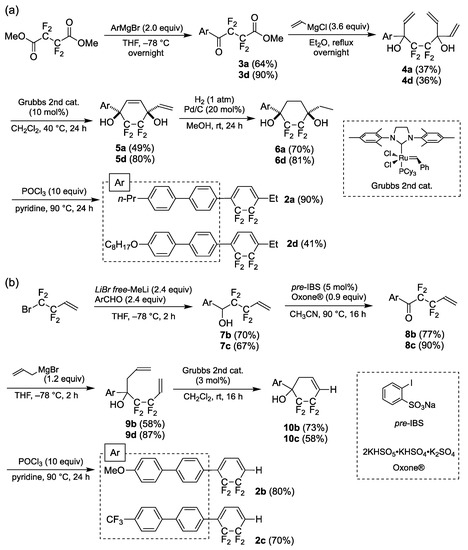Compounds 2a and 2d, featuring an ethyl group attached to the longitudinal molecular terminal, were synthesized from the readily available dimethyl 2,2,3,3-tetrafluorosuccinate according to a reported procedure (Scheme 1a) [18]. The reaction of dimethyl tetrafluorosuccinate with 4-(4-n-propylphenyl)phenylmagnesium bromide in THF at −78 °C overnight followed by hydrolysis under acidic conditions afforded ketoester 3a in 64% yield. Compound 3a was treated with 3.6 equivalents of vinylmagnesium chloride in Et2O, and the reaction mixture was stirred overnight at reflux to afford 4,4,5,5-tetrafluoroocta-1,7-diene (4a) in 37% yield. In the presence of a second-generation Grubbs catalyst, the ring-closing metathesis of 4a in CH2Cl2 (40 °C, 24 h) furnished 1-aryl-4-ethyl-5,5,6,6-tetrafluorocyclohex-2-ene-1,4-diol (5a) in 49% yield. The 24 h exposure of 5a in methanol to H2 at room temperature resulted in catalytic hydrogenation and furnished 1-aryl-4-ethyl 2,2,3,3-tetrafluorocyclohexan-1,4-diol (6a) in 70% yield. Subsequent dehydration with phosphoryl chloride in pyridine at 90 °C for 24 h produced 2a in 90% yield. The octyloxy chain-bearing structural analog 2d was prepared by a similar procedure starting with the addition of 4-(4-octyloxyphenyl)phenylmagnesium bromide.