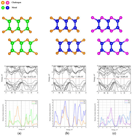 Atomic (top), electronic (middle) structures and densities of states (bottom) of (a) InSe; (b) GaSe; (c) GaTe.