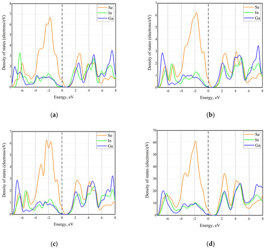 Partial DOS from different atoms in different configurations of InGaSe alloy: (a) GaSe-InSe heterostructure; (b) Ga-vdW-Ga; (c) Ga-vdW-In; (d) randomly distributed cations.