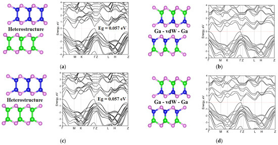 We start our investigation with differently distributed cations. Various possible atomic structures and the corresponding band structures are shown in Figure 3. One can see that the smallest band gap is obtained for the structure marked Ga-vdW-In. Here and below, we will indicate the alternation of sublayers in this way. This notation means that on one side of the vdW gap the nearest metal plane is formed by Ga atoms while at the opposite side the corresponding atomic plane is formed by In atoms. It should also be noted that, due to the boundary periodic conditions required by density functional simulations, the configurations Ga-vdW-Ga and In-vdW-In are identical. The largest gap, among structures with different distributions of metal atoms, is observed for the Ga-vdW-Ga (or In-vdW-In) structure (Figure 3b), where vdW gaps formed by metal atoms of the same nature alternate. In the case of a random distribution of cations, the band gap has an intermediate value, and it can be seen that the main extrema are shifted from the Γ point and blurred. As for the heterostructure, the band gap is slightly larger than for structures with different distributions of metal atoms. The topology of the zones does not have any significant differences compared to configurations with compositional permutations.