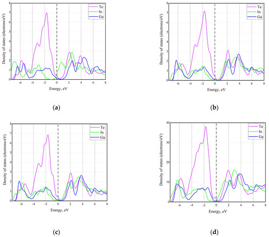Partial DOS from different atoms in different configurations of InGaTe alloy: (a) GaTe-InTe heterostructure; (b) Ga-vdW-Ga; (c) Ga-vdW-In; (d) randomly distributed cations.