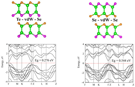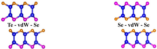 Structures with different distributions of chalcogens in the layers and across the vdW gaps were also studied (Figure 7 and Figure 8). In this case, the differences between the various atom allocations are significant. When the vdW gap is formed by different (Te-vdW-Se) and identical (Se-vdW-Se) chalcogens, they differ significantly in their band gap. This is especially pronounced for Ga-based structures. As for the various distributions of chalcogens in the indium-based structure, such a significant change in the band gap does not occur—the range of changes is much smaller, but the general trend is similar.