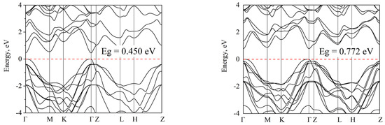 For selenium-based materials, compressing the materials along the c-axis eventually results in the formation of a gapless state. The band gap variation for both compression and stretching deformations can be approximated by linear dependencies, albeit the steepness of the curves is very different (Figure 10), which is most likely due to the anharmonicity of interatomic potentials. We also note that the topology of the zones changed insignificantly.