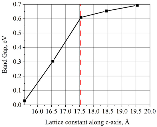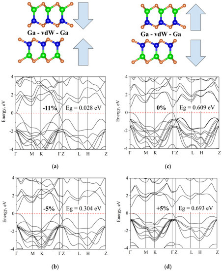To further explore the effect of vdW interactions, we performed a series of simulations, influencing the band gap not by changing the composition of the atoms that form the vdW gap, but by changing the vdW gap width. Only the distance along the c-axis was changed (without changing other parameters and without structure) relaxation. The results are presented in Figure 9 and show that the band gap increases with an increase in the vdW gap.