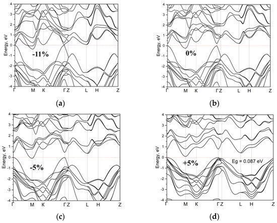 The electronic structure of fully relaxed cell InGaTe (c = 17.19 Å) subjected to compression and stretching along the c-axis: (a–c) band gap is not noticeable for compressions 11%, 0%, and 5%, respectively; (d) increase to 0.087 eV upon stretching by 5%.