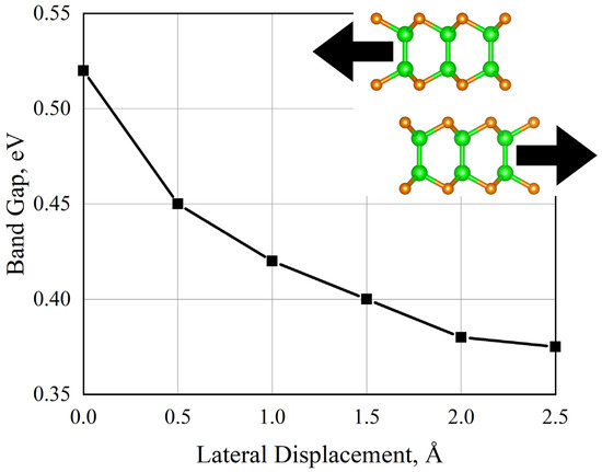 In contrast to the “vertical” displacement of monolayers with respect to each other, lateral displacement of layers without changing the interlayer distance did not demonstrate a similarly large change in the band gap, as is illustrated in Figure 12. It may be noted that such a displacement leads to a decrease in the band gap.