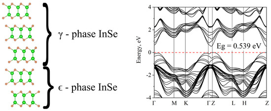 Mixed γ and ϵ InSe phases. Atomic structure on the left and the corresponding band structure on the right.