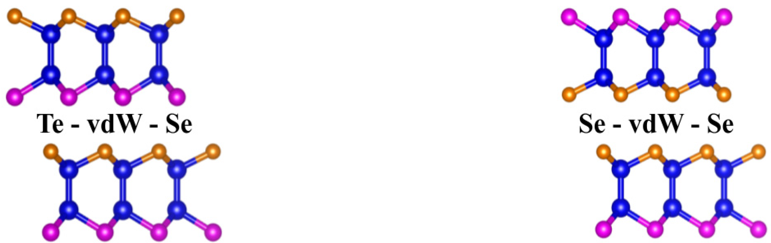 - Zhang, X.; Li, J.; Zhou, X. Tunable bandgap and vacancy defects in GaSe/SnSe van der Waals heterostructure. J. Mater. Res. 2021, 36, 4927–4937. [Google Scholar] [CrossRef]