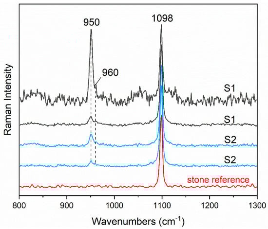 An average of 150 Raman spectra have been acquired on each Angera stone cross sections samples (S1–S4) within a depth of about 150 μm, where there is the highest probability to find intense phosphates bands. Raman spectra provided apparent differences in terms of the newly formed crystals. As can be seen in Figure 1 and Figures S3–S6, besides the dolomite (CaMg(CO3)2) bands ascribed to the stone at 1098, 301 and 178 cm−1, other Raman signals are present in the spectral range related to the PO43− ν1 [16]. The samples decayed and quarry treated with 3 M solution (S1 and S2) unequivocally show a struvite band at around 950 cm−1 [17] in more than 70% of the acquired spectra; a further 6–10% of the spectra exhibit a weak, broad but unambiguously detectable band of calcium phosphate at about 960 cm−1 along with struvite (Figure 2). It is well known that the broader the Raman spectra bandwidth, the lower the degree of mineral crystallinity, thus it is apparent that the broadening of this band is directly related to the low crystalline degree of calcium phosphate, which is likely the reason behind the XRD difficulty of detection.