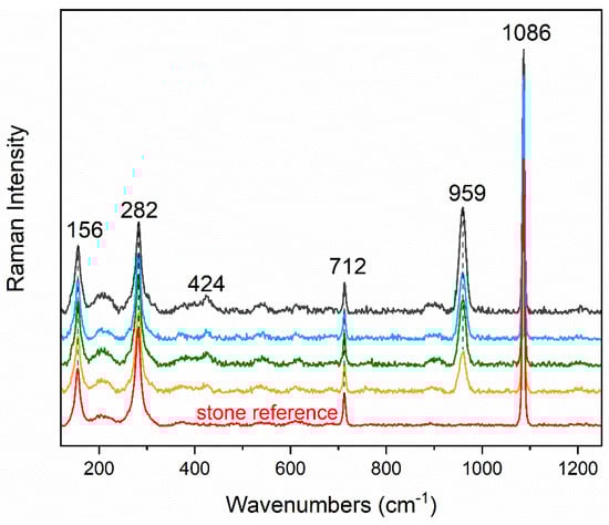 Representative Raman spectra acquired in S5, normalized to 1086 cm−1 calcite band, where the intense PO43− ν1 bands of newly formed calcium phosphates are clearly present (959 and 424 cm−1). Raman spectrum of stone reference is also reported (red spectrum).