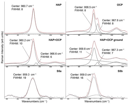 Very importantly, even if the spectral pattern of the physical mixture of HAP and OCP is exactly the sum of the spectra of two pure components, the curve fitting procedure applied to the physical mixtures does not allow separation of the two main components of HAP and OCP peaking at 960.7 and 958.5 cm−1, since they mainly merge in one only, broader band with Lorentzian shape. A minor component is also present at 966.6 and 967.3 cm−1, related to the OCP second component at 967.6 cm−1. Interestingly, also in the S5 spectra (S5a and S5b), only one component has been proved with Gaussian shape. Both in terms of frequency and FWHM, S5a and S5b agree more with the OCP and HAP mixture than with the single HAP and OCP phases, supporting the hypothesis of HAP and OCP co-presence. FWHM changes from 8 in pure phases to 10 in the mixture and, after grinding, it increases to 11, demonstrating that grinding produced a slight decrease of the crystalline order. S5 bands exhibit a larger FWHM (16–19), demonstrating that an even lesser crystalline order exists, which can justify the absence of the minor fitting component at 966–967 cm−1; the shift towards lower wavenumbers can be a consequence of the broadening [27].