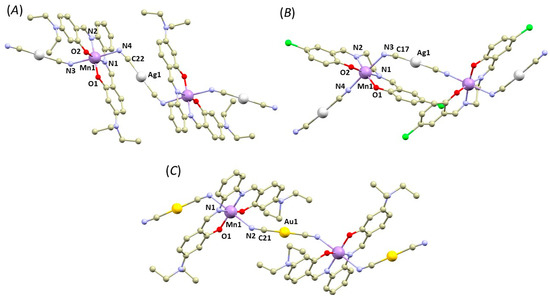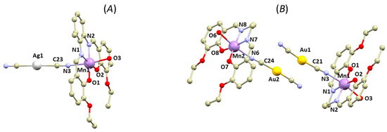 The crystal structures of 1a–2b can be categorized into two types: polymeric complexes bridged by the Au/Ag cyanido-bridging complexes (1a, 1c, and 2a, Figure 1) and dimeric complexes (in 1b and 2b, Figure 2). In the first type, the cyanide complexes ([Ag(CN)2]− or [Au(CN)2]−) act as bridging units between the [Mn(L4x)]+ units, connecting them through the Mn–N coordination bonds in the axial positions. The overall crystal structure can be then described as 1D polymeric, in which the chains interact through weak non-covalent interactions, such as π–π stacking of the aromatic rings (see Supplementary, Figure S1).