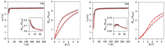 Temperature dependence of the effective magnetic moment, the molar magnetization (inset), and the isothermal magnetizations measured at T = 2 and 5 K for 1a (left) and 1b (right). Empty circles—experimental data, full lines—calculated data with parameters in the text. All data are scaled per one Mn(III) ion.