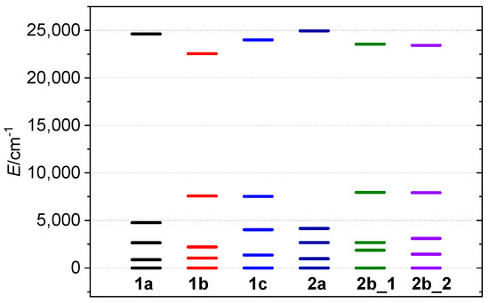 The splitting of the d-orbitals as calculated for 1a–2b by AILFT method.