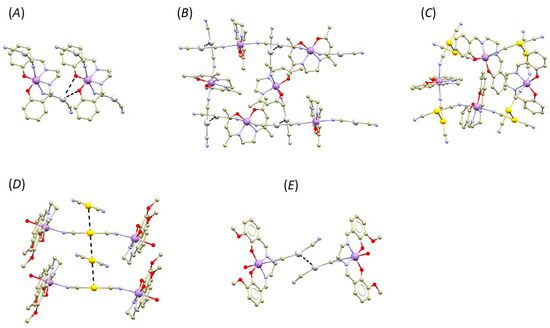 A perspective illustrating selected non-covalent interactions (black dashed lines) in the fragments of crystal structures of [Mn(salen){Ag(CN)2}]n, (A), [Mn(salen){Au(CN)2}]n, (B), [Mn(acacen){Ag(CN)2}]n, (C), [Mn(valen)(H2O)]2[Au(CN)2][Au(CN)2], (D), and [Mn(valen)(H2O)]2[Ag(CN)2][Ag(CN)2] (E). Hydrogen atoms were omitted for clarity. Colour code: carbon (light brown), chlorine (green), gold (yellow), manganese (violet), nitrogen (light blue), oxygen (red), and silver (white).