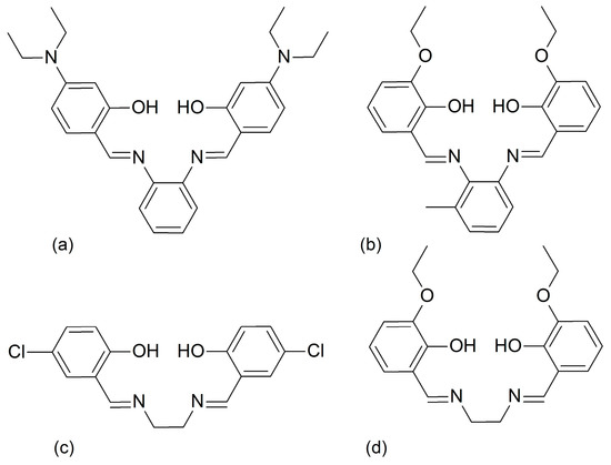 Schematic representations of the tetradentate H2L4 Schiff base ligands: H2L41 (a), H2L42 (b), H2L43 (c), and H2L44 (d).