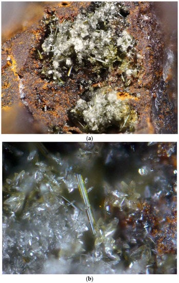 - Vasil’ev, V.I.; Lavrent’ev, Y.G.; Pal’chik, N.A. New data on arzakite and lavrentievite. Dokl. Akad. Nauk. SSSR 1986, 290, 948–951. (In Russian) [Google Scholar]