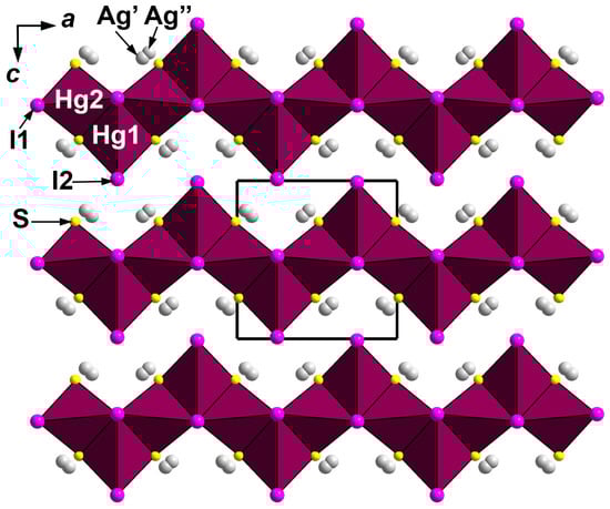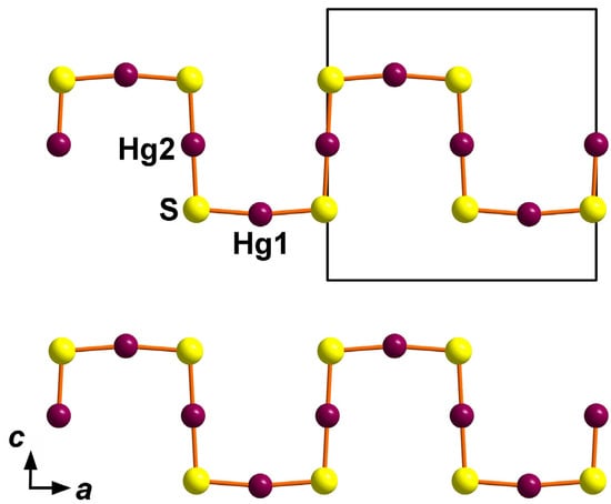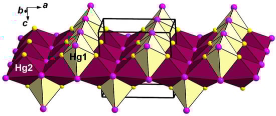 In minerals, the octahedral coordination of Hg2+ by sulphur and halogen atoms was reported for capgaronnite [], perroudite [], and the synthetic analogues of corderoite [] and radtkeite [,]. Distorted Hg2+-centred octahedra with two short Hg–S bonds and four elongated Hg–Hal (Hal = Cl, Br, I) were found in the synthetic analogue of grechishchevite [,]. Pervukhina et al. [,] reported a distorted octahedral coordination of Hg atoms in structures of two polymorphic modifications of Hg3S2Cl2–xBrx(x ≈ 0.5) obtained during the attempts to synthesize an analogue of lavrentievite and in two polymorphic modifications of Hg3S2Br2–xClx(x ≈ 0.5) obtained during the attempts to synthesize an analogue of arzakite. In the structure of capgaronnite, HgS2(Cl,Br)4 octahedra form (010) straight layers connected by the pairs of Ag-centred tetrahedra, whereas in perroudite, face-sharing Hg2+ octahedra form triple chains that are further linked by double chains of Hg-centred octahedra to the framework. In both hanauerite and capgaronnite, Hg–S chains are planar but essentially different in topology: the zigzag chain is reported for capgaronnite, and the “crankshaft-type” chain for hanauerite and structurally close and related synthetic compounds. At the same time, in perroudite, these chains are helical as well as cinnabar in shape. Structural relationships of perroudite with capgaronnite, corderoite, cinnabar, and synthetic HgCuSCl, β-Hg3S2Br2, and Hg3S2I3 are discussed in [] and references therein.
