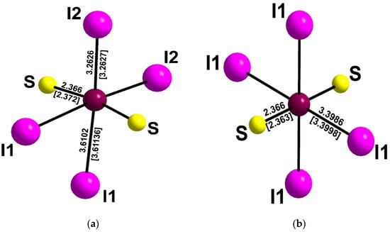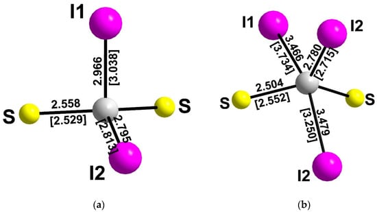 Coordination environments of Ag’ (a) and Ag” (b) sites in the structure of hanauerite. The distances (in Å) for the holotype specimen are given in square brackets and for the cotype specimen without brackets.