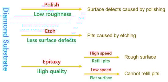 Recently, diamond has been considered as a promising wide-bandgap semiconductor material for electronic device applications due to its excellent thermal conductivity and electrical properties [1,2]. However, the difficulty of N-type doping limits the development of diamond-based electronic devices. Fortunately, high density two-dimensional hole gas (2DHG) can be acquired by hydrogen-terminated diamond film, which has been widely investigated because of its large critical breakdown electric field [3,4]. To date, high-crystal-quality diamond can be acquired by high-press high-temperature (HPHT) [5] or microwave plasma chemical vapor deposition (MPCVD) [6] methods. However, usually an epitaxial diamond layer with a macro-bunching step surface morphology cannot be used to fabricate the devices directly [7]. Devices fabricated directly onto a rough epitaxial layer usually have a worse performance [8]. Therefore, the diamond substrate needs to undergo a Chemical Mechanical Polishing (CMP) process before the fabrication of the diamond devices [9,10,11]. However, it is still difficult to produce a smooth diamond substrate by CMP, which is because of the natural hardness of diamond material. On the other hand, CMP process will also cause surface damage [12]. Therefore, the performance of diamond-based electronic devices on a polished substrate is still weak. In order to remove the surface defects introduced by the polishing process, a pre-etching process need to be added before the diamond epitaxy. The pre-etching process will introduce etch-pits on the diamond substrate, and the etch-pits usually can only be refilled under a high growth rate. In some references (100), face-diamond epitaxial film with a smooth surface has been obtained by quite a low growth rate. For instance, H. Okushi et al. [6] realized the 2D step-flow growth of diamonds with roughness of less than 0.1 nm within a 1 × 1 μm2 area at a growth rate less than 30 nm/h. It was reported that the disorientation angle with respect to the (100) plane must be lower than 1.5°. Currently, it is still hard to produce a high quality single-crystal diamond film with a flat and low root-mean-square (RMS) surface at a high growth rate, especially on diamond substrates with a high disorientation angle. It is essential to the fabrication of diamond devices. Figure 1 lists the problems encountered when diamond substrates are used to fabricate devices. In this paper, high quality epitaxial diamond films with low surface roughness were grown by MPCVD. Hydrogen-terminated diamond MOSFETs with enhanced device performance were fabricated on such epitaxial diamond film.