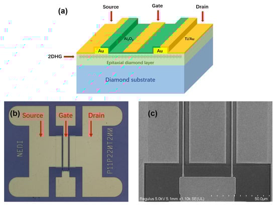 (a) The schematic cross-section structure; (b) optical microscope photo; and (c) SEM image of the H-diamond MOSFET.