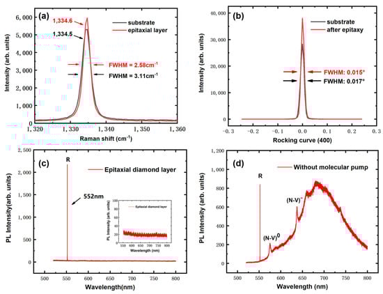 (a) Raman spectra of the diamond substrate and the thick epitaxial layer; (b) XRD results of the epitaxial diamond layer; (c,d) PL spectra of the epitaxial diamond layer.