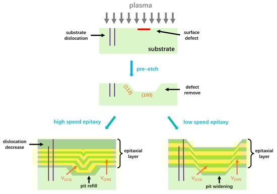 Normally, diamond epitaxial layers have a macro-bunching step morphology [6] due to their step formation energies [7]. A rough surface is not beneficial to the fabrication of electrodes and the performance of the devices. Therefore, diamond devices are usually fabricated on a polished diamond substrate. However, surface defects and damage will be generated in the polishing process, which have a major influence on the performance of devices fabricated on a polished diamond substrate. A pre-etching process, as shown in Figure 4, can remove the surface defects. Under an H-plasma environment, diamond {113} faces have higher etching rates compare to other faces, such as {111} and {100} faces [17]. Etching pits will appear at the area of the surface defects. Diamond substrates with etching pits are also not conducive to the fabrication of devices. Therefore, only a flat-surface diamond epitaxial layer can eliminate the adverse effects of surface defects and etching pits on the device. The etching pits will be recovered in a several microns thick epitaxial layer due to the higher growth rate of {113} than {100} faces, as shown in Figure 4. In past references, atomically flat diamond epitaxial layers can only be realized in an extremely low growth rate [6,18,19]. It is not practical in the semiconductor industry. In our previous works [20], a smooth diamond epitaxial layer was achieved by optimizing the conditions of the pre-etching process. It is important to mention that the distance between the diamond surface and the plasma (dDP) should be precisely controlled during the pre-etching process.
