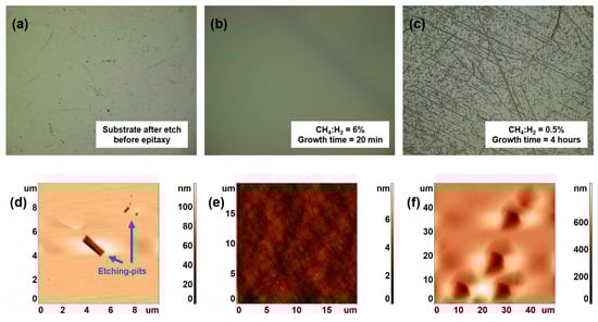 Etching pits with different sizes were found on the diamond substrate after the H-plasma etching process, as demonstrated in Figure 5a, which came from the diamond itself and the polishing process. The substrates used in Figure 5 come from the Zhengzhou Sino-Crystal Diamond Co., Ltd., Zhengzhou, China. These substrates have many more etching pits after the H-plasma etching process compared to the substrates from EDP Corporation, Japan. Figure 5d shows several etching pits of different sizes. They are all rectangular in shape and the rectangular edges are parallel to each other, indicating the effect of crystal orientation on the etching rate. After epitaxy with a high growth rate (~20 μm/h) using a 6% CH4/H2 ratio for 20 min, etching pits were successfully recovered and a flat surface was acquired, as shown in Figure 5b,e. Macro-bunching step morphology was also absent by using a low growth rate (0.5% CH4/H2 ratio). However, the etching pits might become larger as shown in Figure 5c. The post-epitaxial pits, as presented in Figure 5f, are significantly larger and deeper than the pre-epitaxial etching pits. The low growth rate of {113} face is not beneficial for the pits’ recovery, as shown in Figure 4. Normally, pits’ recovery can be achieved by nitrogen doping during the growth [17]. However, it might introduce nitrogen related defects in the CVD diamond layer, which has negative influences on the electronic device’s performance. Therefore, it is important to acquire a high growth rate for realizing the atomically flat epitaxial diamond layer. The reported growth rates and roughness of the diamond’s epitaxial layer with a flat surface morphology are summarized and shown in Figure 6 [6,12,18,19,20,21]. H. Okushi et al. have realized diamond 2D step flow growth and a roughness Ra of less than 0.1 nm in 1 μm × 1 μm area, but the growth rate was only less than 30 nm/h. G. Bogdan et al. achieved a smooth diamond epitaxial layer with a higher growth rate (2.5~4.5 μm/h), but the roughness Ra also increased to 0.5~0.8 nm in a 5 μm × 5 μm area. As the growth rate increases, the surface roughness becomes larger, as indicated by the dash line. In these papers, the diamonds’ substrates usually also needed a low disorientation angle, at least lower than 1.5° with respect to the (100) plane. This may increase the cost of the diamond substrate and the low growth rate may also not be enough to refill the etch pits. In this paper and our previous work, the growth rate was improved obviously, and the surface roughness was also reduced. With the growth rate as high as 7~30 μm/h, the RMS roughness can reach as low as 0.2~0.5 nm in 5 μm × 5 μm area. The high growth rate was acquired by using high temperature and high flow ratio of CH4/H2 during the growth process. N-related peaks cannot be found in the PL result, as shown in Figure 3c. Undoped single-crystal diamonds with atomically flat surfaces and high crystal quality have been obtained, providing support for the fabrication of diamond-based MOSFET devices. Therefore, better device performance can be realized by epitaxial layers attributed to reduced surface defects during growth. With the thickness of epitaxial layers increased, etching pits and polishing bunches have also been decreased, further improving the device’s performance.