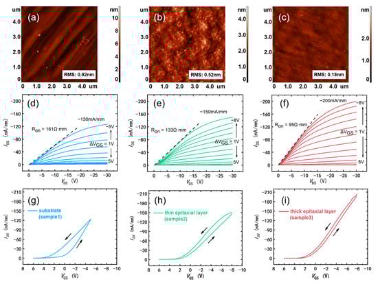The AFM results, direct current output characteristics and the transfer characteristics of the MOSFETs using a diamond substrate (a,d,g), and a thin (b,e,h) and thick (c,f,i) epitaxial diamond layer. The dotted line in (d–f) are the tangent line of the direct current. The arrows in (g–i) represent the scanning direction.