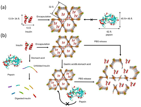 - Chen, Y.; Li, P.; Modica, J.A.; Drout, R.J.; Farha, O.K. Acid-Resistant Mesoporous Metal-Organic Framework toward Oral Insulin Delivery: Protein Encapsulation, Protection, and Release. J. Am. Chem. Soc. 2018, 140, 5678–5681. [Google Scholar] [CrossRef]