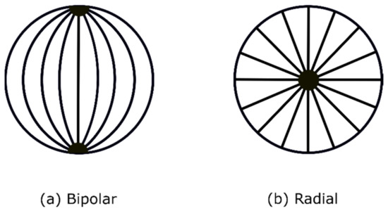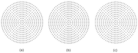 A liquid crystal droplet’s orientation depends on the molecular alignment on its surface. The liquid crystal droplet forms a tangential orientation in pure water under the planar anchoring condition. In the absence of surfactants or any other external fields, a parallel alignment in which the director tends to be aligned tangentially to the droplet interface creates a bipolar configuration [3]. A bipolar orientation is characterized by two defects, which are located at the end of the axis of symmetry at opposite points and are caused by tangential or planar anchoring within the droplet surface, as illustrated in Figure 1a. Experimental studies have shown that thermotropic nematic liquid crystals dispersed in aqueous solutions respond to chemical analytes at the interface. By adsorbing surfactant or lipid at the interface, the planar preferred alignment of liquid crystal then changes to homotropic alignment. Adsorption of surfactants at the surface could cause anchoring transition or change in the easy axis [20]. The droplet’s orientation transitions from a bipolar to a radial within the droplet, which changes the optical appearance [7]. The radial configuration of the droplet exhibits the single-point defect at its center due to its perpendicular anchoring on the surface of the droplet, as illustrated in Figure 1b.
