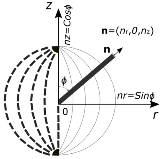 The cross section of a bipolar droplet is shown in Figure 2 in the cylindrical coordinate system (r, θ, z). The director field n is described as follows: