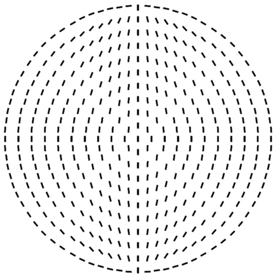 As shown in Figure 2, the two-dimensional droplet has symmetry about the z-axis, so the governing Equations (23) and (24) can be solved numerically for half of a circle, where r* > 0. Then, the initial and boundary conditions are defined as follows: