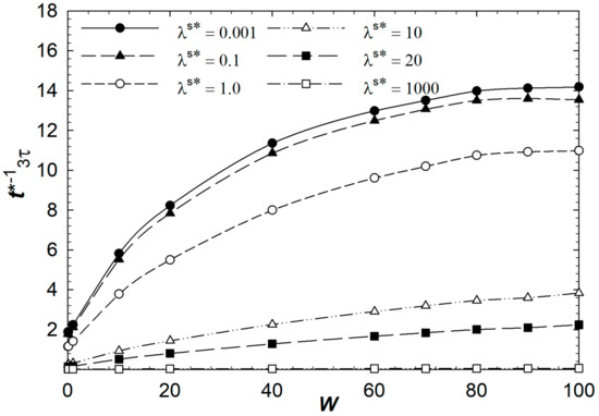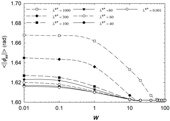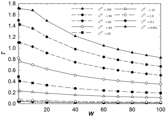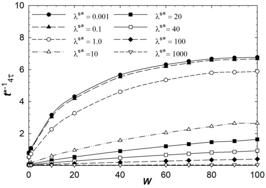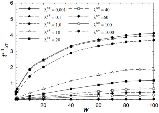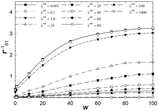 According to Figure 7, Figure 8, Figure 9, Figure 10 and Figure 11, the low surface viscosity parameter in the range of 10−3 ≤ λs* ≤ 10−1 has a reasonably similar and consistent gradual increase pattern through time. This suggests that the viscosity is already at its optimum level and no further decrease is required. However, λs* ≥ 10 has a reasonable linear relationship with W, where the trend switches to gradual changes over time as shown through these figures. For λs* ≥ 102, the relation with W stays linear until the steady state condition is reached. Additionally, it depicts that there is a wide range of changes between 1 < λs* < 10. Furthermore, it was predicted that the process with a range of 10−2 < λs* ≤ 100 exhibits a trend similar to the low surface viscosity through time.
