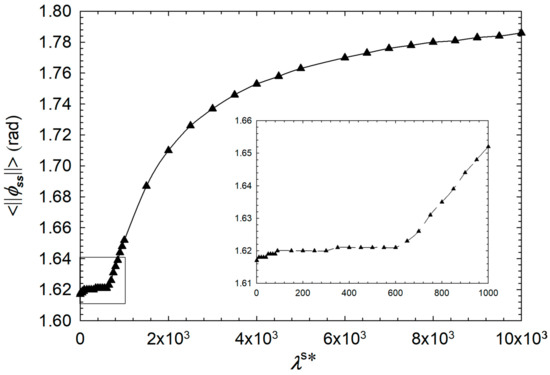The mean magnitude of the orientation angle <||ss||> at steady state versus the dimensionless surface viscosity parameter in the case of weak planar anchoring.