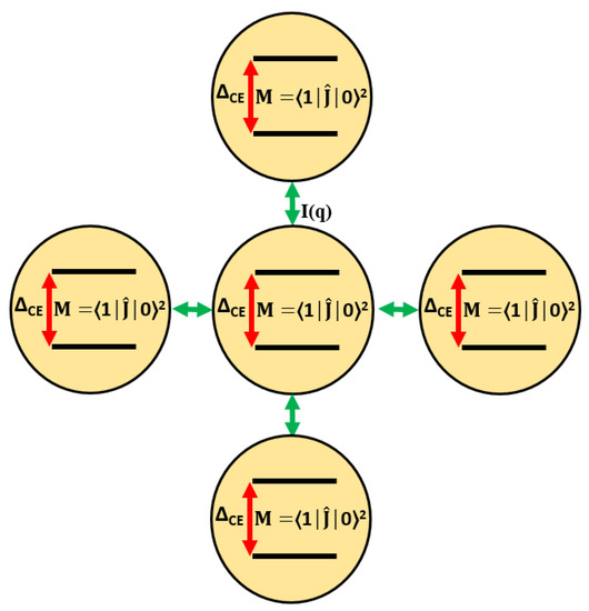 Visualisation of the two-singlet model of induced magnetism. Yellow circles correspond to rare-earth ions in the nodes of the crystal lattice. The exchange interaction I(q) of each ion with its neighbours is indicated by green arrows. For each ion, splitting into two singlets due to the CEF effects is observed: the ground state and the first excited state with a dipole matrix element M coupling these states.