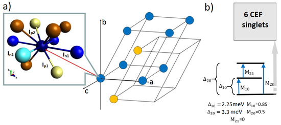 (a) (from [33]) The structure of the nearest environment among the RE occupied positions in the PrNi. There are two RE-ions in the primitive cell, and two equivalent RE-sublattice are shown in blue and bronze. Insert: the structure (see Section 2.3) of the nearest neighbors configuration with 10 RE ions in two coordination spheres involving both sublattices. Additionally shown is 1 variant of 18 possible occupations for RE-ion positions by Pr and La for the particular composition (PrLa)Ni (blue color corresponds to sublattice n, bronze color corresponds to sublattice p, according to Equation (1), I are exchange constants). La ions are marked with light color. (b) Splitting scheme in the crystal electric field for PrNi [13,33]. The allowed magnetic dipole transitions are indicated by arrows.