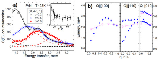 Thus, the ground state in PrNi is necessary for a singlet due to the low symmetry at the Pr site. Nevertheless, experiments measuring magnetic susceptibility [44] and neutron diffraction [13] have revealed that this compound undergoes ferromagnetic ordering at T = 21 K (see inset in Figure 3a). The neutron inelastic scattering experiments were conducted on a single crystal sample of PrNi [13]. The typical spectrum for the Q‖[010] direction is shown in Figure 3a. It was found that the spectrum exhibits two modes of magnetic excitations, whose energy positions are significantly dependent on q. As the temperature was lowered to T = 21 K, there was a gradual reduction in the lower energy excitation frequency, nearly approaching zero at q = 0 (the center of the Brillouin zone), as depicted in Figure 3a.