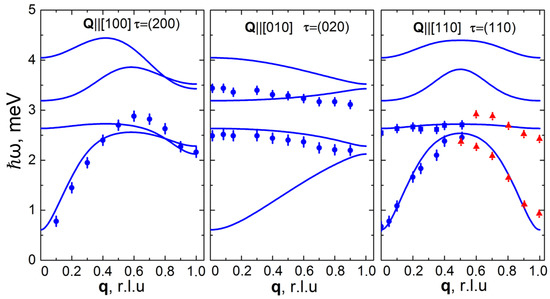 Comparison of calculated (lines), according to the three-singlet model of induced magnetism for the case of two magnetic ions in a primitive cell [33], and experimental (blue points [13] and red triangles [45]) energy dispersions of magnetic excitations in PrNi at T = 23 K.