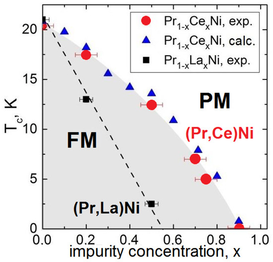 The relationship between T and x in PrLaNi (black squares) [33] and PrCeNi (red circles) [52]. The blue triangles represent the T calculations for PrCeNi using a microscopic state model. The calculation result for PrLaNi is presented as dashed line. The grey area indicates the region of the ferromagnetic state of the (Pr,Ce)Ni system, which is significantly larger than for (Pr,La)Ni.