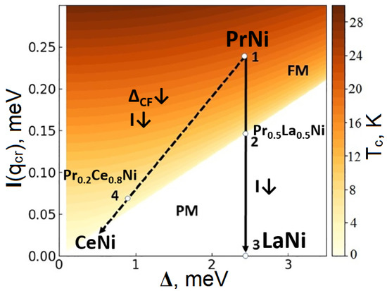 The influence of competing exchange interactions and crystal field splitting on the induced magnetic ordering states in PrNi-based systems is visually presented in Figure 6. The ground state diagram was obtained through calculations within a model of three singlets [52] with fixed values of the dipole matrix elements, corresponding to the case of PrNi and . Point 1 corresponds to the parameter values I(q) and characteristic of PrNi. Upon substituting Pr with non-magnetic La ions, according to the MSM, the value of the parameter I(q) decreases while remains constant. The change in the ground state type during the Pr to La substitution from ferromagnetic (T = 21 K) to paramagnetic is indicated by the solid arrow (1–2–3). The possibility of transitioning to an ordered magnetic state is preserved up to La concentrations of x = 0.5, which is in good agreement with experimental observations [33]. In PrCeNi, both I(q) and decrease with increasing Ce concentration (dashed arrow in Figure 6). The decrease in the exchange parameter is “compensated”, according to Equation (4), by the decrease in the energy gap between the CEF levels. As a result, the ordering temperature decreases much more slowly with increasing x (e.g., point 4 corresponds to x = 0.8) compared to the La substitution case.